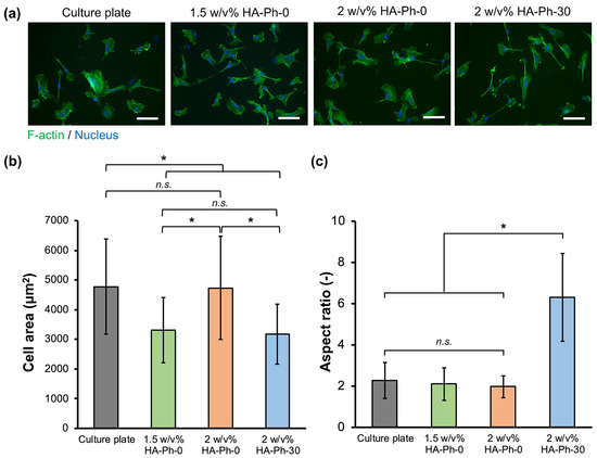 Evaluation of HUEhT-1 cell adhesion and morphology on the hydrogels composed of 2 w/v% or 1.5 w/v% HA-Ph-0 and 2 w/v% HA-Ph-30. (a) Fluorescence micrographs of the HUEhT-1 cells on hydrogels stained with phalloidin iFluor-488 (F-actin) and DAPI (nucleus). Scale bars: 100 μm. (b) Area and (c) aspect ratio of cells on hydrogels (n ≥ 40). * p < 0.05, n.s.: no significant difference (p > 0.05), Tukey’s HSD. Error bars represent the standard deviation.