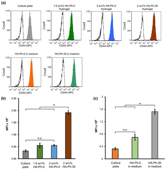 Flow cytometry analysis of HUEhT-1 cells. (a) Representative flow cytometry histogram of HUEhT-1 cells cultured on the hydrogels and well plate (medium containing different molecular weights of HA-Ph). The quantitative mean fluorescence intensity (MFI) values of HUEhT-1 cells cultured on the (b) hydrogel composed of 2 w/v% or 1.5 w/v% HA-Ph-0 and 2 w/v% HA-Ph-30 and (c) culture plate (culture medium consisting of 0.1 w/v% HA-Ph-0 and HA-Ph-30). Error bar: standard deviation (n > 1000 cells). * p < 0.05, n.s.: no significant difference (p > 0.05), Tukey’s HSD.