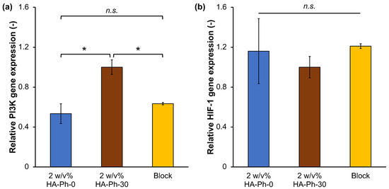Relative gene expression levels of (a) PI3K and (b) HIF-1 in HUEhT-1 cells cultured in 2 w/v% HA-Ph-0 and 2 w/v% HA-Ph-30 hydrogels. Relative Ct values were calculated with respect to the cells cultured on the 2 w/v% HA-Ph-30 hydrogel. Error bar: standard deviation (n = 2). * p < 0.05, n.s.: no significant difference (p > 0.05), Tukey’s HSD.