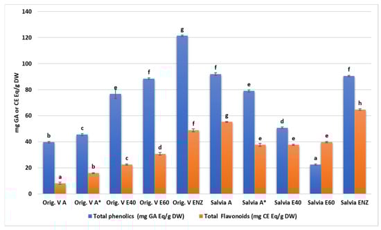All plant extracts were rich in total phenolics with statistically significant differences among their concentration either in each one of the species or between them (Figure 1 and Supplementary Materials Table S1). Among them, higher values were detected in the oregano enzymatic extract (122.4 ± 0.6 mg GAE/g), the salvia aqueous extract (91.99 ± 1.08 mg GAE/g), the salvia enzymatic extract (90.42 ± 0.5 mg GAE/g), and the oregano 60% ethanolic–aqueous extract (88.44 ± 0.6 mg GAE/g). Similarly, the total flavonoid content was increased in salvia and oregano enzymatic extracts (64.75 ± 0.65 mg CE/g and 48.83 ± 1.17 mg CE/g, respectively).