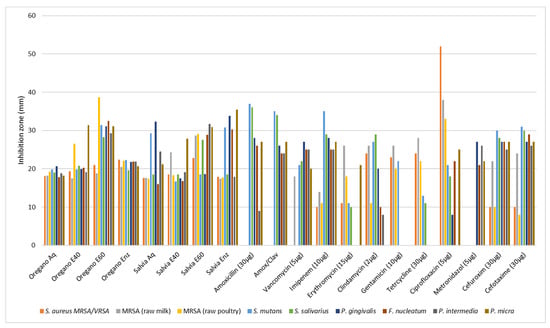 The report on the antibiotic susceptibility patterns of the studied isolates depicts a varied landscape in terms of the recorded zone of inhibition. Amoxicillin (30 μg) produced zones of inhibition from 9 mm (P. intermedia) to 36 or 37 mm (S. salivarius, S. mutants). Amoxicillin with clavulanic acid from 24 to 35 mm, vancomycin (30 μg) from 18 to 27 mm, imipenem (10 μg) from 10 to 35 mm, erythromycin (15 μg) from 0 to 26 mm, clindamycin (2 μg) from 0 to 29 mm, gentamicin (10 μg) from 0 to 266 mm, tetracycline (30 μg) from 0 to 28 mm, ciprofloxacin (5 μg) from 0 to 52 mm, metronidazole (5 μg) from 21 to 27 mm, cefuroxime (30 μg) from 10 to 30 mm, and cefotaxime (30 μg) from 8 to 31 mm. Although most of the strains were susceptible or presented a medium susceptibility to common antibiotics, some pathogens (F. nucleatum, P. gingivalis, P. intermedia, and P. micra) were proven multi-resistant in amoxicillin, amoxicillin and clavulanic, vancomycin, imipenem, erythromycin, tetracycline, and ciprofloxacin with MIC values ranging from 0.00025 to 0.128 mg/mL and only P. micra against gentamicin reached 0.256 mg/mL (Table 5). The two out the three S. aureus isolates were resistant in seven out of ten antibiotics and only the strain isolated from raw milk proved resistant in just two (amoxicillin and amoxicillin/clavulanic acid). In disk diffusion experiments against the oral pathogens, all plant extracts exhibited a variable antibacterial activity with zones of inhibition from 6 to 38 mm (Table 6 and Table 7). In general, the aqueous and ethanolic (E20) O. vulgare extracts were comparable with those of S. triloba while oregano 60% ethanolic–aqueous and S. triloba enzymatic extracts produced wider zones indicating their effectiveness. Most effective was the 60% ethanolic–aqueous extract from oregano in 100% disk content and similarly the 60% ethanolic–aqueous and the enzymatic extracts from S. triloba. As shown in Figure 2, concentrated plant extracts produced wider zones of inhibition from most of the antibiotics.