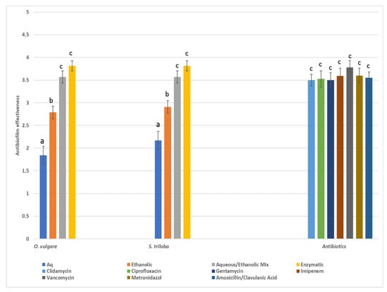 The antibacterial activity of the various plant extracts against oral pathogens as indicated by the minimum inhibitory concentration and minimum bactericidal concentration is presented in Table 8 for O. vulgare and in Table 9 for S. triloba. All extracts were effective against pathogens since MIC values ranged from 0.4 to 12.5 mg/mL and MBC values from 3.1 to 50 mg/mL. However, the oregano enzymatic and 60% ethanolic–aqueous extracts exhibited the lowest mean MIC values (0.39 ± 0 to 3.12 ± 0 mg/mL) against pathogens while the most effective were also with salvia extracts with mean values from 0.39 ± 0 to 1.56 ± 0 mg/mL. Most sensitive strains in oregano extracts were the MRSA isolated from poultry, P. gingivalis, F. nucleatum, P. intermedia and P. micra; meanwhile, in the salvia extracts, the most sensitive strains were MRSA (from raw poultry), S. mutans, S. salivarius, P. gingivalis, P. intermedia, P. micra, and the reference strain S. aureus ATCC 12600 (Ref). Most extracts demonstrated a general antimicrobial effect when compared to the effectiveness of common antibiotics. On comparing the results of Table 5, Table 6, Table 7, Table 8 and Table 9, the higher-in-general-potency of the antibiotics based on the required quantity of substance, with respect to the phytochemical extracts, is obvious. Yet, the term “in general” does not cover all the cases. In many of them, particularly where the conventional antibiotics confront resistance, some phytochemicals show a more effective antibacterial performance. Mult-resistance S. aureus from poultry meat shows resistance to imipenem (11 mm inhibition zone) but at the same time is more sensitive to the aquatic and the enzymatic S. triloba extracts (for 10%-disc content, 6.4 mm, and 7.8 mm inhibition zones, respectively). S. mutans shows resistance to gentamycin (22 mm inhibition zone) but is much more sensitive to the ethanolic 40% O. vulgare extract (8.1 mm inhibition zone). Similarly, P. intermedia was found resistant to amoxicillin (9 mm inhibition zone) but sensitive to the aquatic extract of O. vulgare (6.1 mm inhibition zone). These examples show that phytochemical extracts could potentially be useful in cases of resistance to conventional antibiotics. Another reason that the phytochemical extracts show increased antibacterial potency (mainly regarding MIC values) with respect to the conventional antibiotics is that they are chemically pure substances. In the phytochemical extracts, there are always several different compounds (many of them unknown), in lower concentrations and with unknown synergistic or antagonistic effects, among them. Possibly some of these substances in a chemically pure form may show impressive antibacterial results.
