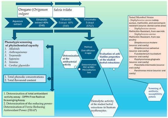 This study utilized phytochemical screening to conduct the qualitative analysis of plant extracts, aiming to identify various classes of secondary metabolites. Moreover, the antibacterial activity of different types of Oregano vulgare and Salvia triloba extracts was determined. To achieve the aim of this study, aqueous, ethanolic, and enzymatic extracts were prepared and screened for phytochemical capacity and antioxidant activities. The determination of the antibacterial activity included phenotypic screening of antibiotic susceptibility pattern of oral and food pathogenic bacterial strains, determination of the minimum inhibitory concentration and minimum bactericidal concentration—via microdilution broth test and in vitro valuation of antibacterial efficacies—of the anti-biofilm properties of the studied herbal extractions. Results: Our study evaluated the phytochemical composition and the antioxidant, antibacterial, and anti-biofilm properties of O. vulgare and S. triloba extracts. The analyzed samples contained bioactive compounds, such as phenolics and flavonoids, contributing to the observed strong antioxidant effect. Furthermore, they exhibited notable activity against oral biofilm formation and demonstrated significant antibacterial efficacy against dental caries’ microorganisms as well as food pathogens. Despite methodological variations, all extracts showed significant antioxidant capacity and promising antibacterial activity against various pathogens, including resistant strains, while also inhibiting biofilm formation. Although limited to two plant species and facing methodological constraints, this study lays the groundwork for future research, indicating the therapeutic potential of O. vulgare and S. triloba extracts. Further exploration is needed to report on underlying mechanisms and validate efficacy through clinical trials.