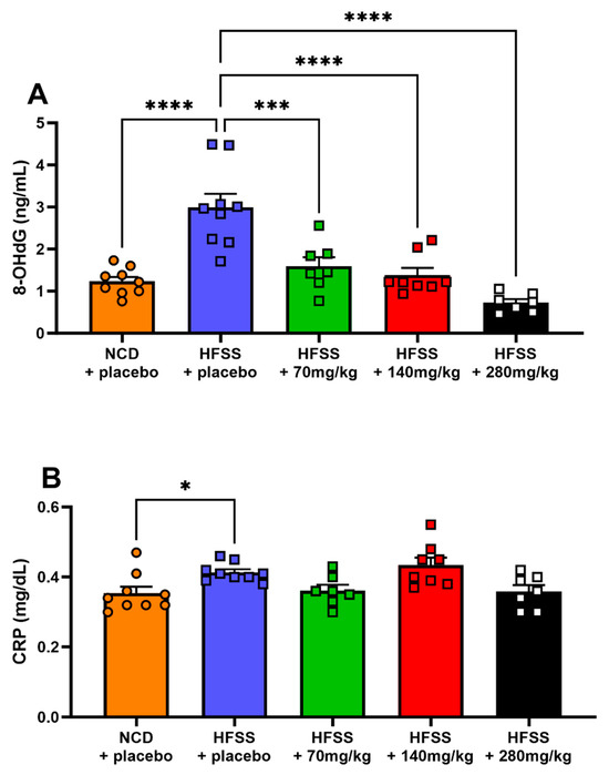 3.4. Effect of HFSS Diet and Hesperidin on Inflammation and Oxidative Stress