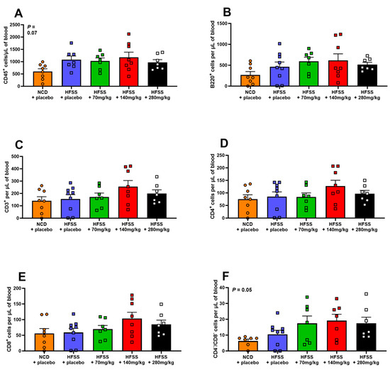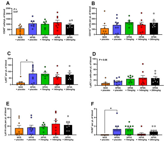 3.5. Effect of HFSS Diet and Hesperidin on Circulating Immune Cells