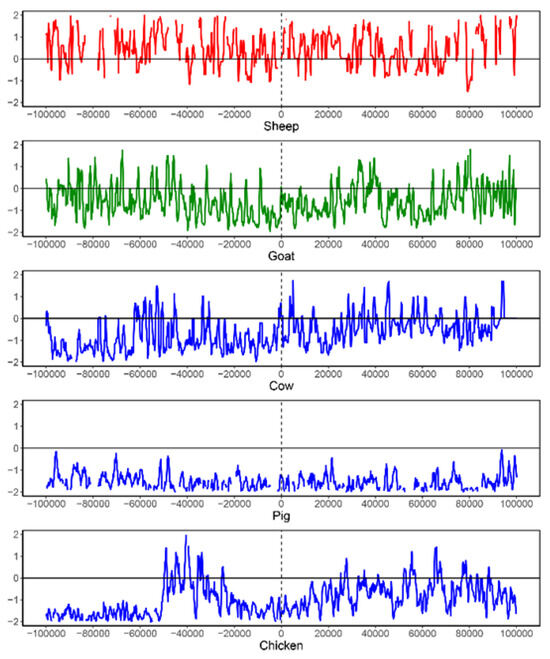 - Alberto, F.J.; Boyer, F.; Orozco-terWengel, P.; Streeter, I.; Servin, B.; de Villemereuil, P.; Benjelloun, B.; Librado, P.; Biscarini, F.; Colli, L.; et al. Convergent genomic signatures of domestication in sheep and goats. Nat. Commun. 2018, 9, 813. [Google Scholar] [CrossRef] [PubMed]
