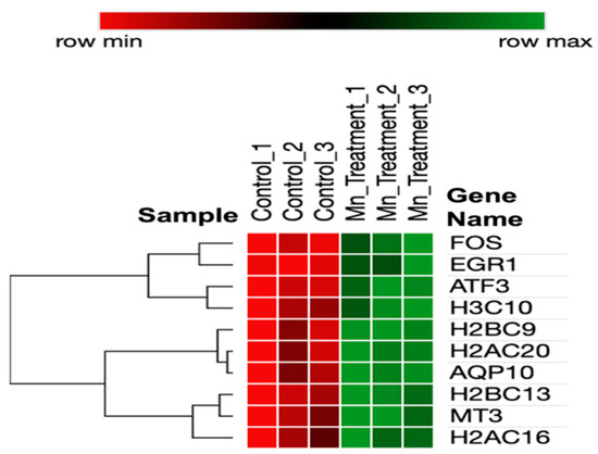 Several immediate early genes (IEGs), ATF3, FOS, and EGR1, were significantly upregulated by manganese exposures. First, ATF3 encodes the CREB protein family of transcription factors. ATF3 expression also mediates the mitochondrial stress response [100]. Secondly, c-Fos and the associated c-Jun potentially form heterodimer AP-1, expressing subsequent survival genes [101]. c-Fos, a proto-oncogene, has been determined to show an immediate increase in response to brain injury, and it increases to protect neurons [102]. Thirdly, EGR1 has been associated with the control of neuronal cell death and inflammation [103,104,105]. Fourth, AQP10, a member of the aquaporin family, was significantly upregulated in response to manganese. Fifth, this aquaporin potentially plays a potential role in the transport of glycerol [106]. We provide a highly useful dendrogram that represents the relationships between Mn-induced genes based on their expression patterns (as shown in the heatmap in Figure 2). The dendrogram branches indicate the presence of co-expression. MT3, H2AC16, and H2BC13 express similar patterns that potentially function through similar neuroprotective pathways. FOS, EGR1, and ATF3 are also biologically related due to the inferred dendrogram relatedness functioning through an immediate early gene pathway.