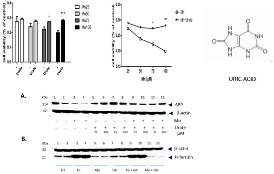 The purine and antioxidant urate offsets manganese-dependent pathways of cell-based toxicity to SH-SY5Y neuroblastoma cells. Top Panels: MTT assay of cell viability: The effects of co-treatment of cells with uric acid (100 mM) on dose-responsive Mn toxicity to SH-SY5Y neuroblastoma cells relative to controls (i.e., Plus/minus urate to mitigate toxicity of 25 mM MnCl2, 50 mM MnCl2, 75 mM MnCl2 and 100 mM MnCl2 to cells for 72 h, N = 6. Bottom Panels: A: Representative Western blot depicting the effects of urate and manganese to modulate APP (FPN-APP complexes export excess iron from cells) in SH-SY5Y neuroblastoma cells. Western blot shows the effect of urate on Mn-dependent repression of APP by Mn in SH-SY5Y cells (9 × 106 cells) when treated for 48 h, (A) (i) Lanes 1–2: control; (ii) Lanes 3–4: 100 µM Mn as 100 µM MnCl2; (iii) Lanes 5–8: 2 sets of increasing UA at 75, 300 µM; and (iv) Lanes 9–12: 2 sets of 100 µM Mn and increasing UA at 75, 300 µM. B: Effect of urate towards Fe- and Mn-dependent modulation of H-ferritin translation; (B) (i) Lanes 1–2: control; (ii) Lanes 3–4: Fe as 100µM ferric ammonium citrate (FAC); (iii) Lanes 5–6: 100 µM Mn as 100 µM MnCl2; (iv) Lanes 7–8: 100 µM UA; (v) Lanes 9–10: 100 µM Mn and 100 µM UA; and (vi) Lanes 11–12: 100 µM Mn and 100 µM UA. Full-length Western blot Gels #95 and #97 are provided in the Supplemental Materials section of this paper. * p < 0.05 for Student’s t-test conducted between Mn and Mn + UA groups. *** p = 0.000165; Student’s t-test conducted between Mn and Mn + UA groups.