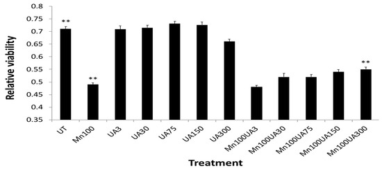 MTT viability assays: In six separate cotreatment assays, cells were cotreated for 72 h with 100 µM UA and separate increasing dosages of 25 µM Mn as MnCl2, 50 µM Mn as MnCl2, 75 µM Mn as MnCl2, and 100 µM MnCl2. In octuplicate pre-treatment assays, cells were pre-treated for 24 h with UA at 3 µM, 30 µM, 75 µM, 150 µM, and 300 µM. Then, the cells were washed and dosed with 100 µM Mn as MnCl2. After the Mn treatment period for both assay types, cell viability was measured by a colorimetric assay either by using the MTT (thiazolyl blue tetrazolium, Sigma-Aldrich (St. Louis, MO, USA)) viability assay or the MTS-Assay (CellTiter96 AQ assay, Promega [Madison, WI]) according to the protocol of the supplier, as reported previously [7]. In parallel, cells were grown in 12-well plates for cell growth analysis. Repetitive aliquots were taken and counted three times using a hemocytometer with trypan blue exclusion assay, as previously reported. For each treatment condition, triplicate wells were counted, and values were averaged.