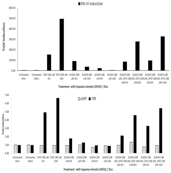 RT-PCR: Triplicate assays were performed in untreated versus deferoxamine (DFO)- and zinc-treated SH-SY5Y cells for 6 and 16 h timepoints with the following conditions (i) control; (ii) control; (iii) 100 µM DFO; (iv) 200 µM Zn as ZnSO4; (v) 100 µM Zn as ZnSO4; (vi) 200 µM Zn as ZnSO4 and 100 µM DFO; and (vii) 100 µM Zn as ZnSO4 100 µM DFO. Total RNA was isolated using TRI-reagent (Sigma-Aldrich) according to the manufacturer’s instructions. Assays were performed using an ABI Prism 7000 system (Applied Biosystems, Foster City, CA, USA). Metallothionein-III mRNA primers, Forward: 5′AGT GCG AGG GAT GCA AAT G 3′. Reverse: 5′ACA CAC AGT CCT TGG CAC ACT T3′. APP mRNA primers (forward, 5-GCCCTGCGGAATTGACAAG-3; reverse, 5-CCATCTGCATAGTCTGTGTCTG-3). transferrin receptor mRNA primers (forward, 5-GGCTACTTGGGCTATTGTAAAGG-3; reverse, 5-CAGTTTCTCCGACAACTTTCTCT-3); and beta-actin mRNA primers (forward, 5-CATGTACGTTGCTATCCAGGC-3; reverse, 5-CTCCTTAATGTCACGCACGAT-3) were purchased from Life Technology.