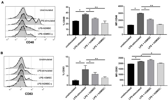 In addition, the immunomodulatory hGMSC capacity and the IFN-γ preconditioning effect were evaluated on the activation (CD40) and maturation (CD83) of LPS-stimulated PBMC. The results revealed that both CD40+ and CD83+ cell frequency, as well as CD40 expression (MFI), were significantly reduced in the presence of both hGMSCs and hGMSC-γ, but the effect was more significant in the presence of hGMSC-γ (Figure 5).