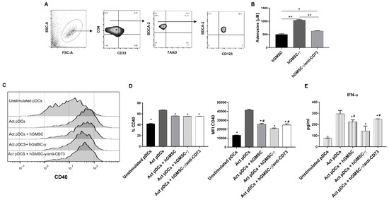 Analysis of the immunomodulatory effect of hGMSC-γ on pDC and the contribution of the purinergic pathway. The pDCs were stimulated with R848 for 24 h in the absence (Act pDCs) or the presence of hGMSCs (Act + hGMSC) or IFN-γ preconditioned hGMSCs (Act pDCs + hGMSC-γ), or IFN-γ preconditioned and anti-CD73-pretreated hGMSCs (Act pDCs+ hGMSC- γ/anti-CD73). (A) Gating strategy to evaluate the viability and purity of 7AAD negative, BDCA-2+CD123+CD4+CD33-blood-purified pDC. (B) Adenosine quantification, as described in Section 2. (C) Representative histograms showing CD40 expression. (D) Graphics showing the frequency of CD40+ and CD40 expression (MFI) in pDC. (E) IFN-α secretion in the supernatants in the cocultures. Data show an analysis of the results obtained from three independent experiments performed in duplicate. The Mann–Whitney test was performed for statistical analysis. * = p ≤ 0.05, ** = p ≤ 0.01 of statistical differences compared to Act pDCs; and # = p ≤ 0.05 of statistical differences compared to the Act pDCs + hGMSC-γ condition.
