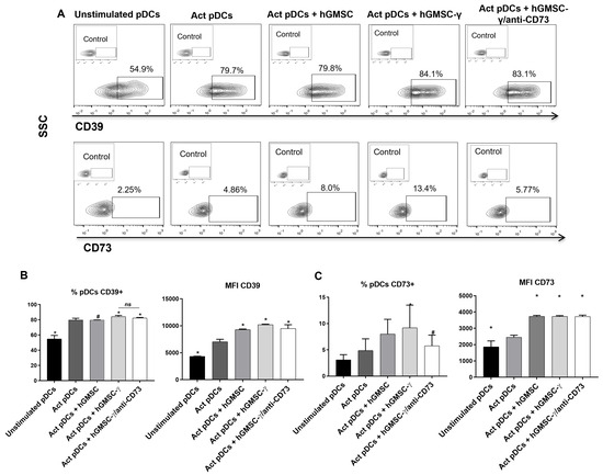 Analysis of hGMSCs’ influence on the expression of the purinergic halo in pDC. (A) Representative contour plots showing CD39 and CD73 expression on pDCs. (B,C) Graphics of the statistical analysis of frequency (%) and expression (MFI) of CD39 and CD73 on pDCs, showing the results obtained in three independent experiments made in duplicate. The Mann–Whitney test was performed for statistical analysis. * = p ≤ 0.05 of statistical differences compared to Act pDCs; and # = p ≤ 0.05 of statistical differences compared to the Act pDCs + hGMSC-γcondition. Control: isotype control.