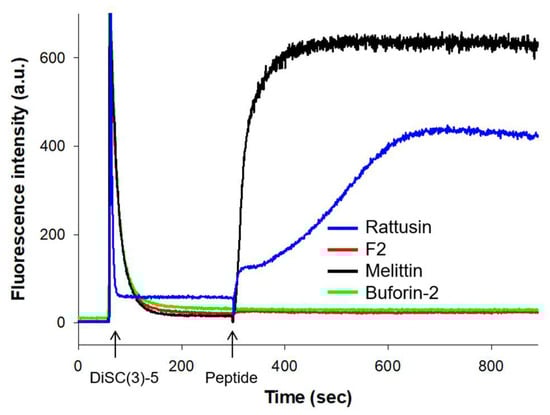 The initial strong quenching of DiSC(3)-5 fluorescence indicated the dye’s accumulation within the membrane. Following a stabilization period of 300 s, peptides were introduced (as indicated by an arrow in
