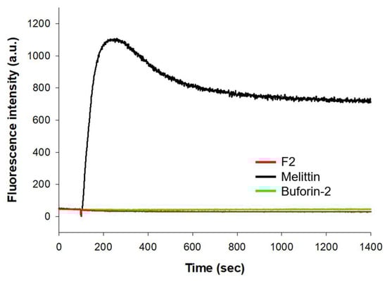 Figure 3. Such a response is consistent with melittin’s established role in compromising membrane integrity, thereby allowing SYTOX Green to bind to nucleic acids and fluoresce. In stark contrast, the F2 fragment and buforin-2 did not show a similar increase in fluorescence intensity over the course of the assay. The absence of fluorescence enhancement with these peptides suggests that, unlike melittin, they do not cause membrane permeabilization under the conditions tested. Consequently, the data illustrate a clear distinction in the ability of melittin to disrupt cell membranes when compared to F2 and buforin-2.