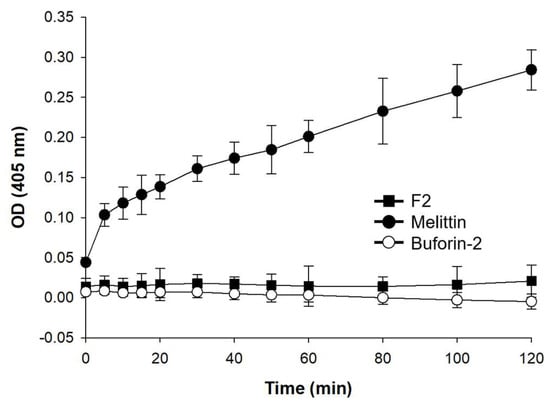 Despite the change in absorbance demonstrated by the positive control melittin, F2 did not alter the absorbance, similar to the negative control, buforin-2. This outcome, alongside the results from depolarization and SYTOX experiments, suggests that F2 does not target the inner membrane.
