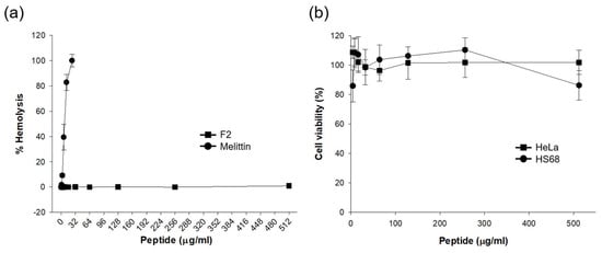 Further, the MTT assay was implemented to determine the effect of F2 on the viability of mammalian cells. Two cell lines, Hs68 (human fibroblasts) and HeLa (human cervical cancer cells), were treated with F2. The peptide maintained cell viability without notable toxicity up to 512 μg/mL for both cell types (