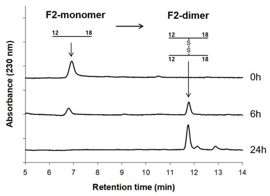 Interestingly, the monomeric form of F2 (prior to disulfide bonding) showed antimicrobial activity similar to that of the dimeric form. This observation suggests that the monomeric F2 can spontaneously form dimers under physiological conditions, which we confirmed using HPLC analysis after incubation in MIC buffer (