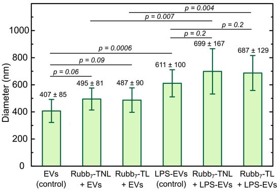DLS particle size distributions of monocytic large EVs released by unstimulated and LPS-stimulated THP-1 monocytic leukemia cells before and after staining (1 h with 10 µM of Rubb7-TNL or Rubb7-TL at 298 K, room temperature). Results are expressed as the mean ± standard deviation of eight independent experiments for each treatment group. EV samples were isolated from eight different batches (n = 8) of unstimulated and LPS-stimulated THP-1 cells. The statistical significance of differences between two sets of data was measured using a two-sample independent t-test (calculated using Origin 6.1 software). The minimal requirement for statistical significance was set at p < 0.05.