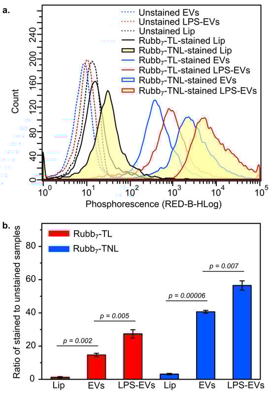 Comparison of phosphorescence for representative samples of unstimulated and LPS-stimulated EVs isolated from THP-1 monocytic leukemia cells and artificial DOPC/cholesterol liposomes in PBS. (a) Samples stained with 10 µM of Rubb7-TNL or Rubb7-TL in PBS for 1 h at 298 K (room temperature), followed by removal of excess Ru-stain. (b) Ratios of median phosphorescence of stained and unstained vesicles. Error bars show the standard deviation of the ratios of five independent experiments for each treatment group. EV samples were isolated from five different batches (n = 5) of unstimulated and LPS-stimulated THP-1 cells. The statistical significance of differences between two sets of data was measured using a two-sample independent t-test (calculated using Origin 6.1 software). The minimal requirement for statistical significance was set at p < 0.05.