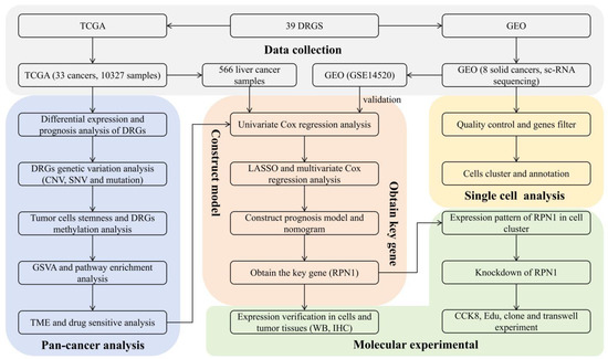 We obtained 39 DRGs from the previously published literature (10) (Table S1). Subsequently, we downloaded fragments per kilobase per million mapped fragments (FPKM) expression data and clinical data for 10,327 samples of 33 cancer types from TCGA database. The tumor types and sample numbers are presented in Table S2. Additionally, we acquired copy number variation (CNV), single nucleotide variation (SNV), and methylation data from TCGA database. Gene and drug sensitivity data were downloaded from the Genomics of Drug Sensitivity in Cancer (GDSC) and Cancer Therapeutic Response Portal (CTRP) databases. Finally, we obtained transcriptomic datasets for liver cancer (GSE14520) and single cell datasets for various tumors, including lung adenocarcinoma (GSE123902), liver cancer (GSE138709), colon cancer (GSE188711), breast cancer (GSE180286), clear cell renal cell carcinoma (GSE156632), esophageal adenocarcinoma (GSE222078), gastric cancer (GSE183904), and pancreatic cancer (GSE154778) from the GEO database.