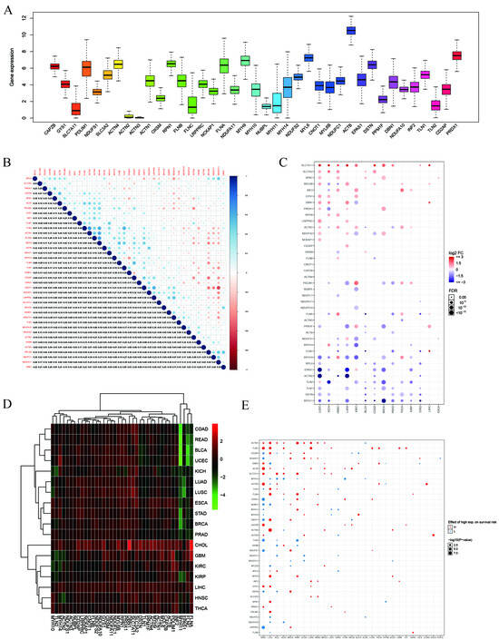 Differential expression and prognostic features of DRGs. (A) Expression profiles of DRGs in various cancers. (B) Correlation analysis between DRGs, with blue and red indicating positive and negative correlation, respectively. (C) Differential mRNA expression of DRGs in normal and tumor tissues. (D) Heatmap displaying aberrant expression of DRGs in 18 tumor types, with red and green indicating upregulation and downregulation, respectively. (E) Prognostic analysis of DRGs. The size of the dots represents the significance level (p-value). Red and blue dots indicate higher and lower prognostic risk, respectively, when the gene is highly expressed.