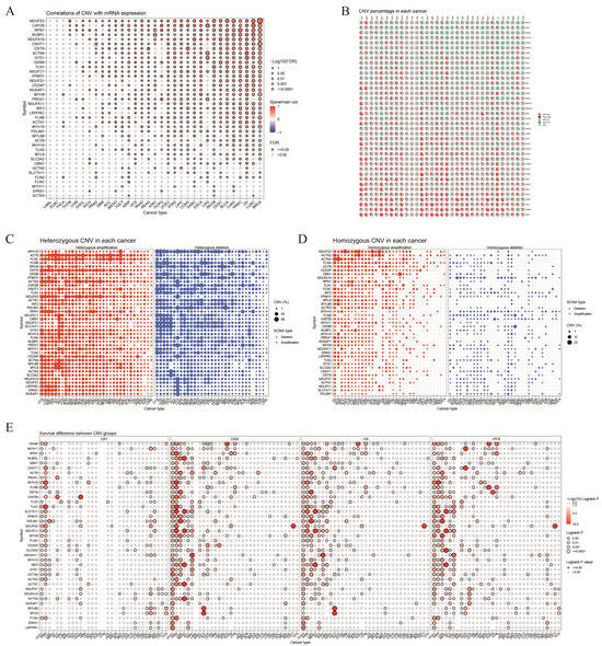 CNV features of the DRGs. (A) Correlation between the percentage of CNVs and DRGs mRNA expression in various cancers, with the size and color intensity of the dots representing the p-value and the correlation coefficient, respectively. (B) Proportions of CNVs in DRGs across various cancers, where Hete Amp, Hete Del, Homo Amp, Homo Del, and None indicate heterozygous amplification, heterozygous deletion, homozygous amplification, homozygous deletion, and no CNV, respectively. (C) Proportions of heterozygous amplification and deletions in DRGs across various cancers. (D) Proportions of homozygous amplification and deletions in the DRGs across various cancers. (E) Prognostic differences between the CNV and wild-type DRG groups. HR values > 1 indicate a risk factor, whereas values < 1 indicate a protective factor. OS: overall survival, DSS: disease-specific survival, DFI: disease-free interval, PFS: progression-free survival.