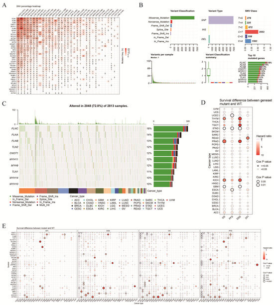 SNV analysis revealed widespread SNVs in the DRGs across various cancers, with UCEC, SKCM, and COAD showing the highest mutation rates (Figure 4A). The DRGs exhibited varying SNV frequencies. For example, in UCEC, FLNA had the highest SNV frequency (approximately 98%), whereas ACTN3 showed minimal variation. Subsequent analysis revealed that the primary classifications of SNVs in the DRGs were missense and nonsense mutations, with SNP being the most common type. These mutations primarily involved cytosine-to-thymine and adenine-to-guanine transitions. The top ten DRGs with the highest mutation frequencies were FLNC (18%), FLNA (14%), FLNB (13%), TLN2 (12%), CNOT1 (12%), MYH11 (12%), MYH9 (12%), TLN1 (11%), MYH14 (10%), and MYH10 (10%) (Figure 4B,C). Single-factor Cox regression analysis indicated that mutations in the DRGs may significantly affect patient prognosis. Prognostic analysis also revealed significant differences in patient outcomes between the mutant and wild-type groups for certain genes, including FLNA, ACTN2, and MYH14 (Figure 4D,E).