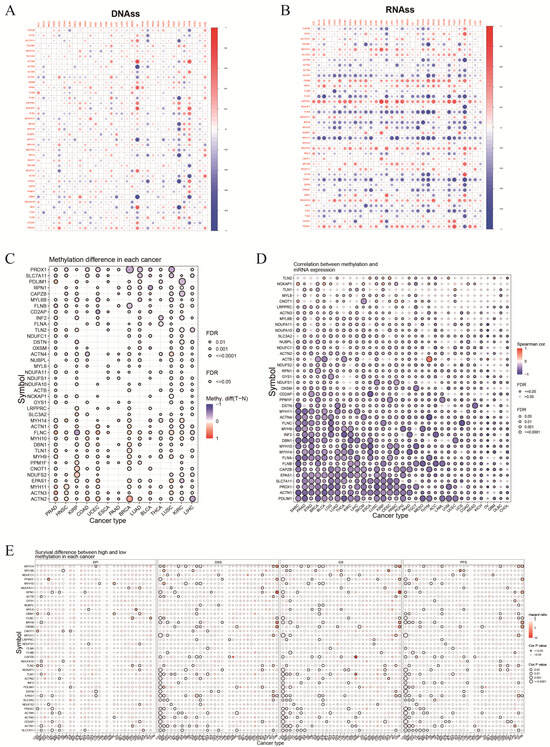 Correlation of DRGs with cell stemness and methylation. (A,B) Correlation between DRGs mRNA expression and DNAss (DNA methylation) and RNAss (RNA methylation) levels, with red and blue indicating positive and negative correlation, respectively. (C) Differential methylation of DRGs between tumor and normal tissues, with red and blue dots indicating increased and decreased methylation in tumors, respectively, and color intensity representing the level of difference. (D) Correlation between methylation and mRNA expression levels of DRGs. (E) Relationship between the degree of methylation of DRGs and prognosis in various cancer types.