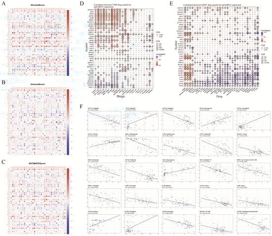 TME score and drug sensitivity analysis. (A–C) Correlation analysis between mRNA expression of DRGs and stromal, immune, and ESTIMATE scores. (D,E) Correlation analysis between IC50 values of antitumor drugs and DRGs based on CTPR and GDSC databases, where red and blue indicate positive and negative correlation, respectively. (F) Top 25 antitumor drugs with the highest correlation with DRGs.
