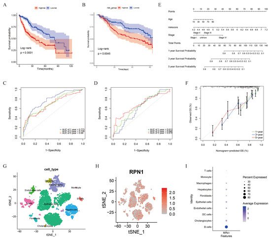 Construction of hepatocellular carcinoma prognostic model and single cell analysis. (A) Survival analysis between high- and low-risk groups in TCGA database. (B) Survival analysis between high- and low-risk groups in the GSE14520 dataset. (C) ROC curve for RS predicting OS in TCGA dataset. (D) ROC curve of the GSE14520 dataset. (E) Nomogram predicting patient OS. (F) Calibration curve to evaluate nomogram accuracy. (G) t-SNE plot of dimension reduction and clustering in the GSE138709 dataset. (H) Feature plot showing the expression of RPN1 in GSE138709. (I) Dotplot displaying the expression of RPN1 in the different subgroups of GSE138709.