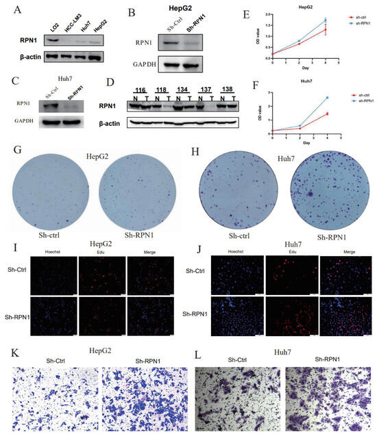 We conducted a series of experiments to investigate the molecular function of RPN1 in liver cancer. First, we measured RPN1 expression in three LIHC cell lines and found that RPN1 was downregulated in tumor cells compared to normal cells (Figure 8A). Western blot analysis revealed relatively lower RPN1 expression in tumor tissues than in adjacent normal tissues (Figure 8D). Immunohistochemistry (IHC) results indicated cytoplasmic localization of RPN1, supporting its established function as an N-oligosaccharyl transferase in the endoplasmic reticulum (Figure S5A). Next, we successfully knocked down RPN1 in HepG2 and Huh 7 liver cancer cells (Figure 8B,C). CCK8 experiments demonstrated that RPN1 knockdown increased the proliferation of HepG2 and Huh 7 liver cancer cells (p < 0.05) (Figure 8E,F). The sh-RPN1 group exhibited a significantly higher number of cell colonies than the control group in colony formation assays, indicating that RPN1 knockdown enhanced cell proliferation and colony-forming abilities (p < 0.05) (Figure 8G,H and Figure S5C,F). EdU staining results showed a significant increase in the percentage of EdU-positive cells in the sh-RPN1 group compared to the control group (p < 0.05) (Figure 8I,J and Figure S5B,E). Transwell assays revealed a significant increase in cell migration across the porous membrane in the sh-RPN1 group compared to the control group, suggesting that RPN1 knockdown promoted cell invasion (p < 0.05) (Figure 8K,L and Figure S5D,G). These findings suggest that RPN1 may be involved in regulating liver cancer progression and could serve as a promising target for therapeutic interventions in liver cancer.