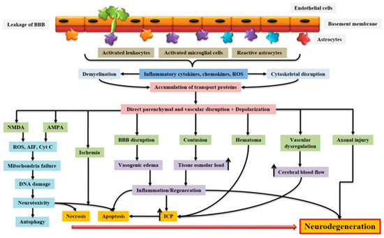 Schematic representation of the pathophysiology of acquired brain injury. BBB dysfunction caused by injury allows for the transmigration of activated leukocytes into the injured brain parenchyma, which is facilitated by the upregulation of cell adhesion molecules. Activated leukocytes, microglia, and astrocytes produce ROS and inflammatory molecules such as cytokines and chemokines that contribute to demyelination and disruption of the axonal cytoskeleton, leading to axonal swelling and the accumulation of transport proteins at the terminals. On the other hand, excessive accumulation of glutamate and aspartate neurotransmitters in the synaptic space due to spillage from severed neurons activates NMDA and AMPA receptors located on post-synaptic membranes, which allow for the production of ROS. As a result of mitochondrial dysfunction, molecules such as apoptosis-inducing factor (AIF) and cytochrome c are released into the cytosol. These cellular and molecular events including the interaction of Fas with its ligand Fas ligand (FasL) ultimately lead to caspase-dependent and -independent neuronal cell death. BBB: blood–brain barrier; NMDA: N-methyl-D-aspartate receptor; AMPA: α-amino-3-hydroxy-5-methyl-4-isoxazole propionic acid receptor; ROS: reactive oxygen species; Cyt c: cytochrome c; ICP: intracranial pressure; AIF: apoptosis-inducing factor [10]. Creative Commons Attribution-Available via license: CC BY 4.0 [10].