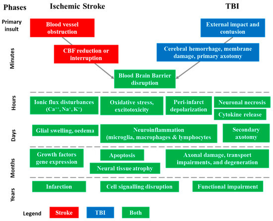 Sequence of pathophysiological events involved in acute ischemic stroke (AIS) and traumatic brain injuries (TBI) in their successive phases [9,17]. The injury process can be divided into four distinct phases: primary insult (minutes), acute (hours), subacute (days–weeks), and chronic outcome (months–years). These phases help in understanding the progression of structural and functional abnormalities associated with AIS and TBI.