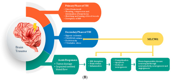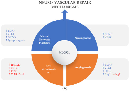 Regulated effects of MLC901 on key neurovascular repair mechanisms in A—AIS and B—brain trauma. (A) Preclinical models: MLC901 enhances these neurovascular repair mechanisms with its multimodal actions of up- (blue arrows) or down (red arrows)-regulation on growth factors (BDNF, VEGF, and angiopoietins 1 and 2), cytokines (TNFα and interleukins), chemokines (CCL2), and other mediators (HIFα, TLR-4, and Prx-6). MLC901: red arrows for downregulation; blue arrows for upregulation. BDNF: brain-derived neurotrophic factor; VEGF: vascular endothelial growth factor; CCL2: chemokine (C-C motif) ligand 2; HIFα: hypoxia-inducible factor 1-alpha; TLR4: Toll-like receptor 4; Prx6: peroxyredoxin-6. (B) Pathological events happening during primary and secondary phases of traumatic brain injury (TBI) with a description of the short-term and long-term consequences of brain trauma. The blue font shows the phases of TBI that MLC901 can regulate. ↑ shows the increased oxidative stress, ↓ shows reduced oxidative stress [59]. Creative Commons Attribution-Available via license: CC BY 4.0–Ref. [59].