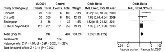 Systematic reviews and meta-analyses of clinical trials on the use of MLC601 in AIS clinical trials have shown favorable results on functional outcomes (Figure 5) and motor recovery (Figure 6) [89,101]. As all of the studies in the systematic review concerned non-acute strokes with OTT windows of ≤ 1 week to 6 months, the effect of time window was analyzed by including only CHIMES patients who started treatment after 48 h from AIS onset [89]. This poor prognosis factor increased the OR to 1.63 (95% CI, 1.20–2.22, p = 0.002) and further reduced heterogeneity, suggesting that the patients treated later in the CHIMES study were more similar to those included in previous studies.