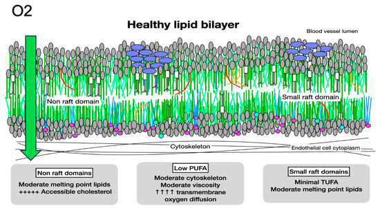 Oxygen diffusion in healthy membranes. Healthy membranes present almost no barrier to oxygen diffusion. With primarily moderate-melting-point lipids, moderate cytoskeletal elements, less than 1% PUFAs, small rafts, and minimal molecules with very high cholesterol affinity, such as LCSFAs and trans unsaturated fatty acids, the total cholesterol content of a healthy membrane is moderate. The cholesterol present is associated with molecules with low or moderate cholesterol affinity, making it accessible and available for signaling.
