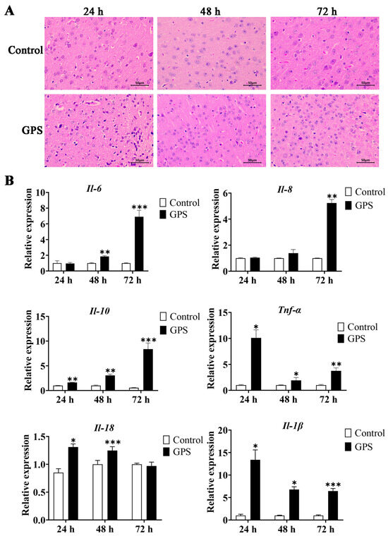 After 24, 48, and 72 h infection with GPS, the mouse was dissected and the brain tissue samples were collected for histopathological section analysis. The results showed that the meninges of the infected mice exhibited typical meningitis symptoms with obvious shedding (Supplementary Figure S1). The types and quantities of inflammatory cells increased, showing obvious infiltration of inflammatory cells in the GPS-infected mice cerebrum (Figure 1A). In addition, the mRNA expression levels of inflammatory cytokines (Il-6, Il-8, Il-10, Il-18, Il-1β, and Tnf-α) in GPS-infected mice were significantly increased compared to the control group (p < 0.05, Figure 1B), which indicated that GPS successfully induced brain inflammation in mice.