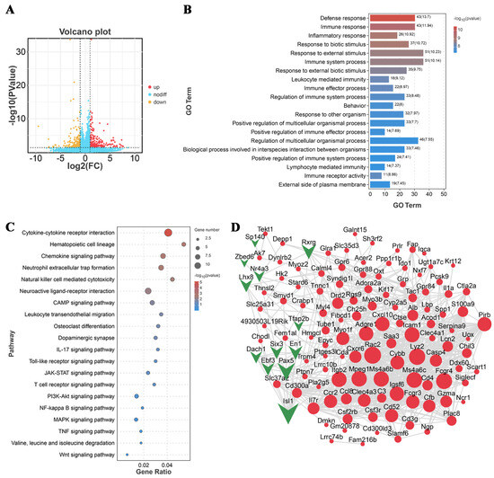 Deep sequencing revealed the transcriptional profiles in the cerebrum of GPS-infected mice. (A) Volcano plot showing DEGs in the cerebrum of GPS-infected mice. Red dots represent upregulated genes and yellow dots represent downregulated genes. (B) GO-enrichment analysis for DEGs. (C) KEGG pathways significantly enriched by DEGs in the GPS infection group. (D) PPI network constructed by DEGs in the GPS infection group. Upregulated expression is indicated by red, and downregulated expression is indicated by green. The node degree evaluating the interaction frequency is represented by node size. GPS: G. parasuis.