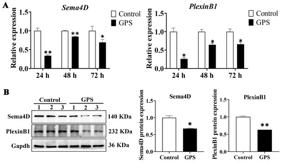 Validation of the differential expression of angiogenetic genes (Sema4D and PlexinB1) in the cerebrum of GPS-infected mice (24, 48, and 72 h). (A) qRT–PCR validation for mRNA expression changes of Sema4D and PlexinB1. (B) Western blot validation for protein expression changes of Sema4D and PlexinB1 after 72 h of GPS infection, original western blots are available in the Supplementary Materials. Data are presented as the mean ± SD (n = 3). GPS: G. parasuis. * p < 0.05, and ** p < 0.01, versus the control group.