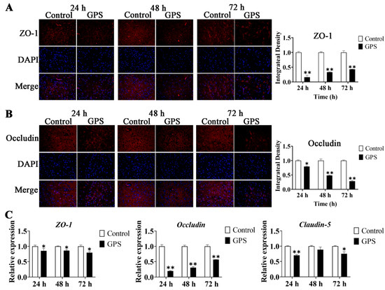 To confirm the effects of GPS infection on the BBB integrity of the mouse cerebrum, the organization and distribution images of ZO-1 and occludin in the mouse cerebrum were detected using immunofluorescence (IF). GPS infection significantly altered the distribution patterns of ZO-1 and Occludin (Figure 4A,B). The integrated density of fluorescence was quantified using densitometric analysis in ImageJ 1.8.0. Staining for ZO-1 and Occludin in the cerebrum of GPS-infected mice (24, 48, and 72 h) appeared to be significantly reduced and fragmented compared to that of the control group (p < 0.01; p < 0.05) (Figure 4A,B). The mRNA expression of ZO-1, Occludin, and Claudin-5 was determined by qRT–PCR in the cerebrum of GPS-infected mice (24, 48, and 72 h). The results showed that GPS infection significantly decreased the expression of ZO-1 (p < 0.05), Occludin (p < 0.01), and Claudin-5 (p < 0.05) in the mouse cerebrum (Figure 4C). These results indicated that GPS infection could disrupt the TJs in the mouse cerebrum in vivo.