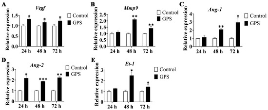 Relative expression of BBB-permeability marker genes in the cerebrum of GPS-infected mice (mean ± SD, n = 3). (A) Vegf, (B) Mmp9, (C) Ang-1, (D) Ang-2, and (E) Et-1. GPS: G. parasuis. * p < 0.05, ** p < 0.01, and *** p < 0.001, versus the control group.