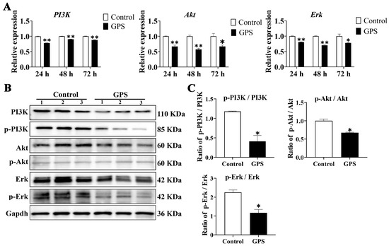 The expression and activation of the PI3K/Akt/Erk pathways were detected by qRT-PCR and Western blotting, respectively. As shown in Figure 6A, the mRNA expression of PI3K, Akt, and Erk in the cerebrum of GPS-infected mice (24, 48, and 72 h) was significantly decreased compared to that in the control group (p < 0.05). The protein expression levels of PI3K, p-PI3K, Akt, p-Akt, Erk, and p-Erk in the mouse cerebrum were detected by Western blotting (Figure 6B). The results showed that, after 72 h of GPS infection, the phosphorylation of PI3K (p-PI3K/PI3K) in the GPS-infected group was significantly decreased (p < 0.01), as was the phosphorylation of Akt and Erk (p-Akt/Akt and p-Erk/Erk) (p < 0.05) compared to the control group (Figure 6C).