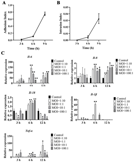 GPS infection model in mouse brain microvascular endothelial cells. Adhesion (A) and intrusion (B) of GPS to bEnd.3 cells (mean ± SD, n = 3). (C) Changes in the expression of inflammatory factors (Il-6, Il-8, Il-18, Il-1β, and Tnf-α) in GPS-infected bEnd.3 cells (mean ± SD, n = 3). The horizontal axis represents the infection time of GPS. MOI: Multiplicity of infection; GPS: G. parasuis; * p < 0.05 and ** p < 0.01, versus control group.
