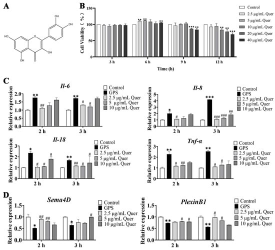 Effects of quercetin on the cytotoxicity, inflammation, and angiogenesis of bEnd.3 cells. (A) Structure of quercetin. (B) Cytotoxicity of quercetin on bEnd.3 cells at different concentrations (2.5 µg/mL, 5 µg/mL, 10 µg/mL, 20 µg/mL, and 40 µg/mL). (C) Effects of quercetin (2.5 µg/mL, 5 µg/mL, and 10 µg/mL) on inflammatory factors (Il-6, Il-8, Il-18, and Tnf-α) in GPS-infected bEnd.3 cells (mean ± SD, n = 3). (D) Effects of quercetin (2.5 µg/mL, 5 µg/mL, and 10 µg/mL) on angiogenetic genes (Sema4D and PlexinB1) in GPS-infected bEnd.3 cells (mean ± SD, n = 3). The horizontal axis represents the pretreating time of quercetin. Quer: Quercetin, GPS infection: MOI = 1:1, 6 h; GPS: G. parasuis; * p < 0.05, ** p < 0.01, and *** p < 0.001, versus the control group; # p < 0.05, ## p < 0.01, and ### p < 0.001, versus the GPS group.