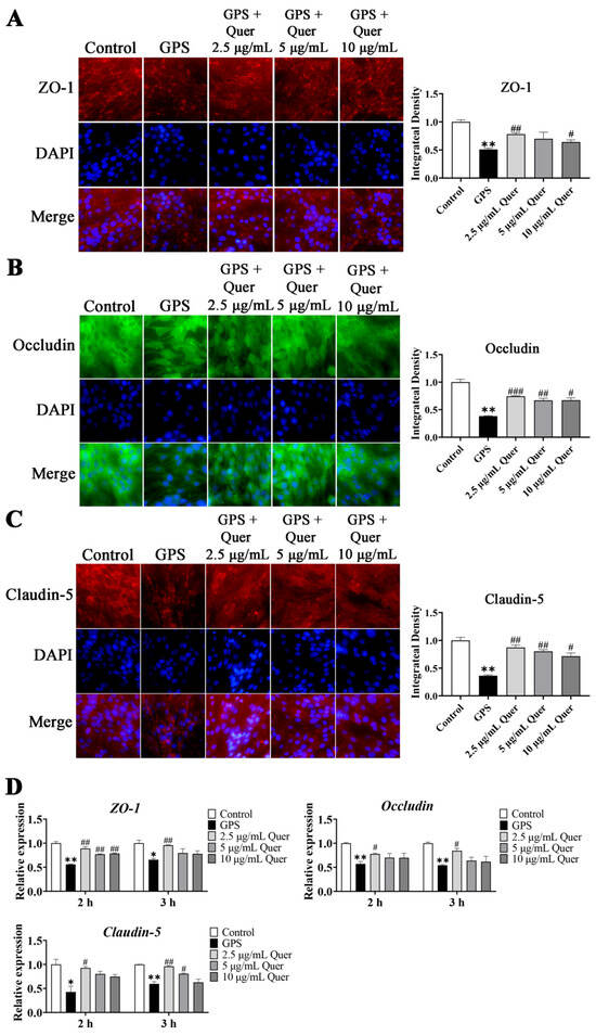 To confirm the effects of quercetin on protecting bEnd.3 cell monolayers against GPS-induced degradation of TJ proteins, we used immunofluorescence assays to determine the intercellular junctions of ZO-1, Occludin, and Claudin-5 proteins in bEnd.3 cells. Immunofluorescence intensity showed that the intercellular junctions of ZO-1, Occludin, and Claudin-5 were disrupted by GPS (MOI = 1:1, 6 h) (p < 0.01, Figure 9A–C). Quercetin improved the integrity of ZO-1 at 2.5 µg/mL, significantly at 10 µg/mL (p < 0.05, Figure 9A). Quercetin also significantly improved the integrity of Occludin and Claudin-5 at 2.5 µg/mL, 5 µg/mL, and 10 µg/mL (p < 0.05, Figure 9B,C). The mRNA expression of the TJ proteins in bEnd.3 cells showed the same regulatory pattern, in that GPS decreased the expression of ZO-1, Occludin, and Claudin-5 (p < 0.01, Figure 9D), and quercetin increased the expression of these TJs (p < 0.05, Figure 9D), with 2.5 µg/mL and a 2 h treatment of quercetin exhibiting the best effect. The results indicated that quercetin had a protective effect on TJs in bEnd.3 cells.