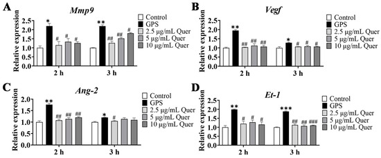 Quercetin decreased the expression of BBB-permeability marker genes in GPS-infected bEnd.3 cells (mean ± SD, n = 3). (A) Mmp9, (B) Vegf, (C) Ang-2, and (D) Et-1. Quer: Quercetin; 2 and 3 h: time of quercetin pretreatment; GPS infection: MOI = 1:1, 6 h; GPS: G. parasuis; * p < 0.05, ** p < 0.01, and *** p < 0.001, versus control group; # p < 0.05, ## p < 0.01, and ### p < 0.001, versus infection group.