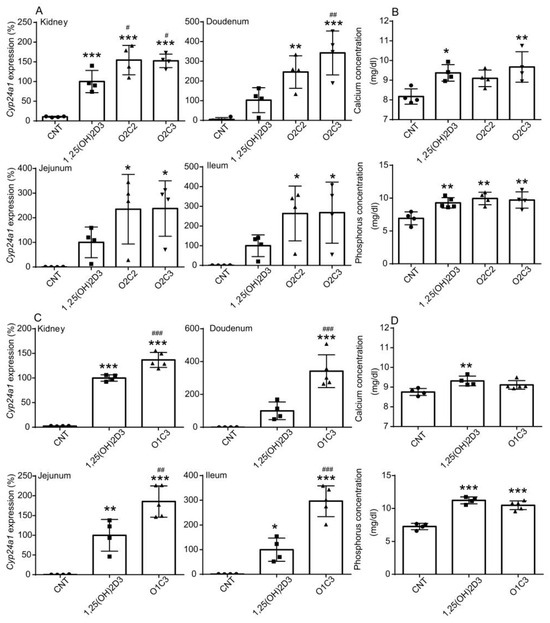 3.2. Effects of Vitamin D Derivatives on Tissue Cyp24a1 Expression and Plasma Calcium and Phosphorus Levels in Mice