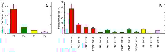 Phospholipid distribution of POA in human monocytes. (A) Cellular POA content in phospholipids as shown by class. The different phospholipid classes were separated by thin-layer chromatography and their POA content was determined by GC-MS after converting the fatty acid glyceryl esters into fatty acid methyl esters. (B) Profile of POA-containing phospholipid molecular species. The distribution profile of POA between phosphatidylcholine (PC, red bars), phosphatidylethanolamine (PE, green bars), phosphatidylinositol (PI, yellow bars), and phosphatidylserine (PS, pink bars) species was determined by LC-MS. The data are shown as mean values ± standard error (n = 3).