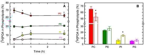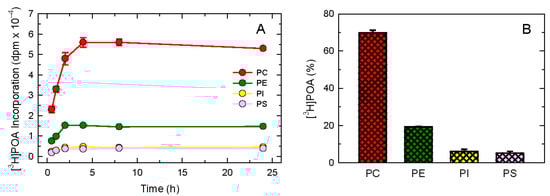 To confirm these findings, we conducted a pulse experiment where the monocytes were exposed to [3H]POA for 30 min, thoroughly washed to remove any unincorporated label, and then left in culture free of labeled fatty acid. Under these conditions, the relative distribution of the label between phospholipid classes was measured. Figure 2B shows that such a distribution did not vary with time; the fatty acid that was initially incorporated into either PC, PE, PI, or PS remained in its initial location. Thus, the distribution of POA was almost identical to that determined during the time-course experiment depicted in Figure 2A, and also very similar to that found for the endogenous preexisting fatty acid mass (Figure 1A). Collectively, these results suggest that the rate of incorporation of POA into the different classes of phospholipids does not change with time, and the fatty acid remains in the phospholipid class that initially incorporated it. This behavior contrasts with that of polyunsaturated fatty acids such as arachidonic acid (AA) [56,57,58,59], which are known to undergo profound remodeling between phospholipids that substantially changes their initial distribution [60,61,62].
